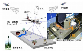 GNSSにより撮影時のカメラの位置を取得。IMU(慣性計測装置)でカメラの傾きを取得します。