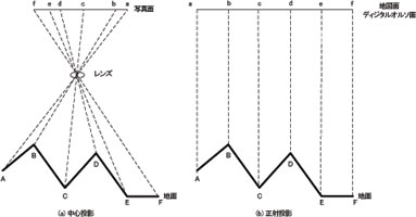 左図が単純に撮影した場合の「中心投影」。右が「正射投影」を行った場合のイメージ画像です。