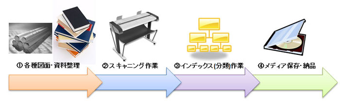 このようなことに備えて、重要な書類や図面をスキャニング(画像データ化)、分類(インデックス化)し、メディアに保管することで保管場所の省スペース化、データの散逸化を防ぐだけでなく、簡易的な検索方法を準備するファイリング作業を行うことで、誰もが見たいときに見るという利便性の向上が可能になります。